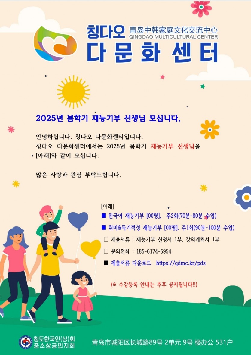 2025년 봄학기 다문화센터 재능기부 선생님 모집 공고
